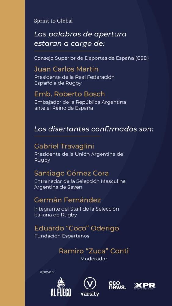 Galería de Imagenes Hoy desde 19 hs en el Consejo Superior de Deportes, Sala Samaranch, se abrirá una mesa panel sobre las estrategias de expansión internacional y éxito del rugby argentino. El evento es organizado por la Embajada de España junto con la Cancillería argentina y habrá diferentes oradores entre los que se citan al Head Coach de Los Pumas 7s, Santiago Gómez Cora, a Germán Fernández integrante del staff de la selección italiana de Rugby, al Presidente de la UAR Gabriel Travaglini y a Eduardo "Coco" Oderigo de la Fundación Espartanos Rugby entre otros. Fotógrafo: Rugby Champagne Fuente: Jorge Ciccodicola, enviado especial a Madrid Galería de Imagenes