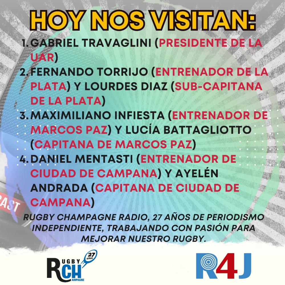 Galería de Imagenes De 18 a 20hs no te pierdas nuestro habitual programa de radio, el 1014 de Rugby Champagne con invitadas/os de lujo. Estará como invitado Gabriel Travaglini el presidente de la UAR que responderá a todo ¿Seguirá Michael Cheika a cargo del equipo? ¿Qué balance hace del año? ¿Como ve a Los Pumas de cara a los partidos del próximo año? Esto y mucho más…Además saldrán al aire los equipos campeones del torneo femenino 2023 con sus HC y capitanasí-Fernando Torrijo (entrenador) y Lourdes Diaz (sub capitana) de La Plata -Maximiliano Infiesta (entrenador) y Lucía Battagliotto (capitana) de Marcos Paz -Daniel Mentasti (entrenador) y Ayelén Andrada (capitana) de Ciudad de Campana Escuchanos en vivo por acá, por nuestra página web o bajate la APP R4J y viví el rugby como desed hace 27 temporadas. Fotógrafo: Rugby Champagne Fuente: Jorge Ciccodicola Galería de Imagenes