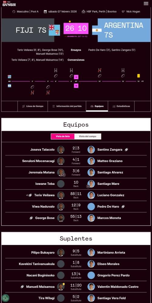 Galería de Imagenes El equipo argentino no logró hacer pie en el primer partido del grupo y fue superado 26 a 10 ante Fiji. Los dirigidos por Santiago Gómez Cora arrancaron bien el encuentro y marcaron dos tries a través de Pedro De Haro y Santino Zangara.Las conversiones, al igual que en Singapur, fueron un déficit ya que el conjunto argentino no logró marcar ninguna en sus dos conquistas.El equipo fijiano fue de menor a mayor en el partido y anotó cuatro conquistas para dar vuelta el resultado y dejar a Los Pumas 7s sin punto bonus en esta primera presentación.Fue final y triunfo para Fiji por 26 a 10.Los próximos partidos:LOS PUMAS 7S vs Sudáfrica, desde las 4.14hsLOS PUMAS 7S vs España, desde las 7.30hsEl minuto a minuto y las formaciones (en la imágen): Fotógrafo: Archivo RCH Fuente: BRIAN WILLCHAM Galería de Imagenes