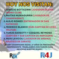 Galería de Imagenes Esta tarde desde las 18 y hasta las 20hs te llevamos el programa número 1013, con todos los ascendidos del último fin de semana de la URBA y el nuevo campeón del Nacional de Clubes. No te lo pierdas. Un nuevo porgrama en Radio 4 de Junio y sus más de 150 repetidoras a todo el país y el mundo, con estos invoitados: Fotógrafo: Rugby Champagne Fuente: Jorge Ciccodicola Galería de Imagenes