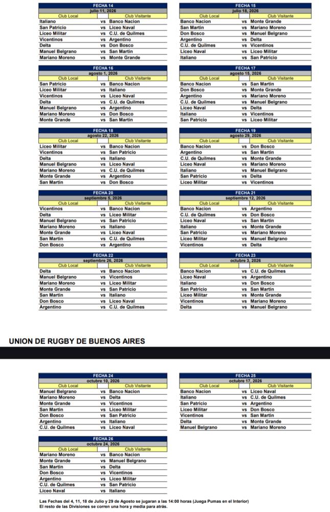 Galería de Imagenes La tercera categoría del rugby de Buenos Aires ya conoce su fixture para el año que viene. El 14 de marzo inicia el campeonato y tendrá su final el 14 de noviembre. El campeón se quedará con el ascenso directo a Primera "A", mientras que del 2° al 5° se definirá el segundo ascenso.Los últimos dos descenderán a la Primera C, ya que esta temporada no habrá playoffs.En la primera fecha, el plato fuerte estará en Quilmes, donde el CUQ que viene de ser finalista recibirá al ascendido Liceo Militar.Monte Grande, que llega como campeón, será local ante Mariano Moreno, mientras que Vicentinos, otro de los ascendidos, visitará al CAR. Galería de Imagenes
