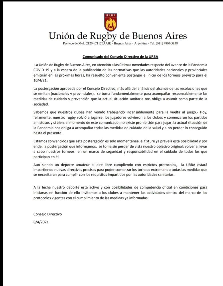 Galería de Imagenes Mediante una circular hacia todos los clubes, La Unión de Rugby de Buenos Aires confirmó la postergación del inicio de la competencia a raíz del brote de contagios que afecta al AMBA y las nuevas medidas impuestas por el Gobierno. Este fin de semana, el rugby de Buenos Aires volvía a competir pero la pandemia volvió a detener su andar. Por lo tanto, la URBA tomó como medida postergar por una semana el inicio de los torneos. El comunicado completo: Fotógrafo: Prensa URBA Galería de Imagenes