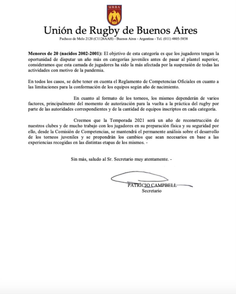Galería de Imagenes Luego de un extenso análisis llevado a cabo por la Comisión de Competencias, se decidió aprobar el proyecto de categorías elaborado por la misma para la disputa de los torneos juveniles del año próximo. Con el cuidado de la salud y seguridad de los jugadores como prioridad, desde la URBA se evaluó el impacto de la pandemia tanto en la posible disminución en la cantidad de jugadores hasta la vuelta a la normalidad así como el estado físico de los mismos luego de un año o más sin jugar al rugby. A continuación, compartimos la circular emitida por la Unión de Rugby de Buenos Aires. Galería de Imagenes