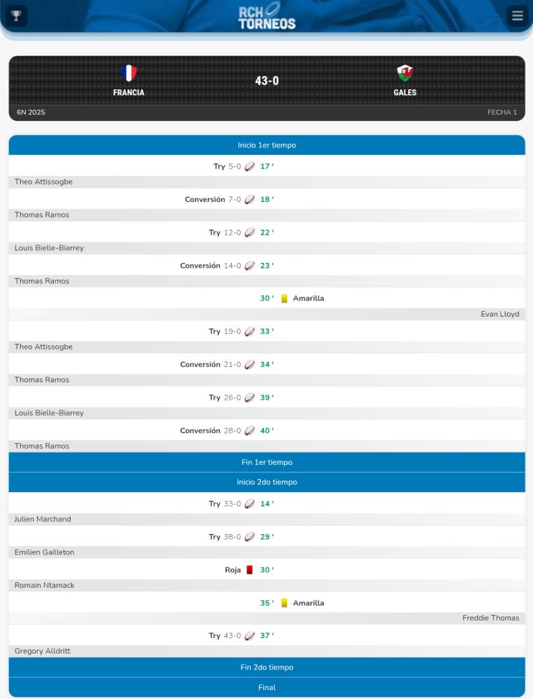 Galería de Imagenes En París el local no dejó dudas frente al Dragón y lo derrotó por 43 a 0 con punto bonus incluído en la primera fecha del torneo con una actuación soberbia. El partido inaugural del Campeonato 2025 se llevó a cabo bajo las luces del viernes por la noche en el Stade de France. A medida que aumentó la euforia de los franceses su equipo respondió.El dueño de casa bajo la conducción de Dupont y Ntamack dominó de principio a fin a Gales y no lo dejó respirar. La defensa de Francia fue el motor del equipo.La única mancha de la jornada para uno de los candidatos al título fue la tarjeta roja a su apertura por un tackle alto. El Rugby Champagne estuvo presente y sus backs se divirtieron dentro de la defensa de Gales, que no levanta cabeza.Francia espera conseguir su primer título desde 2022, mientras que el Dragón quiere poner fin a una racha de 13 derrotas consecutivas. Los hombres de Warren Gatland intentarán volver a estar entre los 10 mejores del ranking de World Ruby.La síntesis: Fotógrafo: Six Nations Fuente: BRIAN WILLCHAM Galería de Imagenes