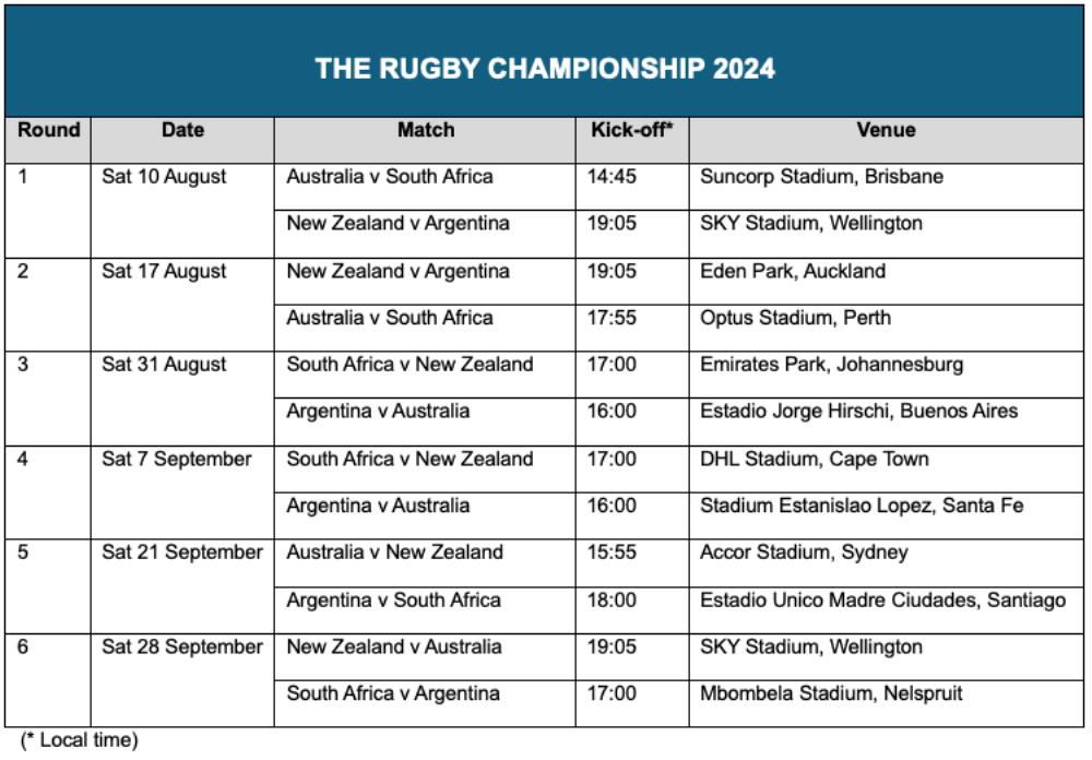 Este año, Nueva Zelanda, campeona de 2023, jugará dos partidos en Sudáfrica y recibirá a Argentina en dos partidos. Sudáfrica, actual campeona mundial de rugby, jugará dos partidos en Australia después de recibir a Nueva Zelanda, mientras que Australia jugará dos partidos en Argentina.