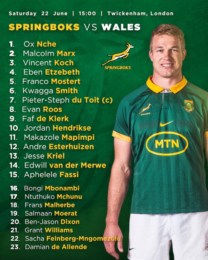 Jordan Hendrikse y Edwill van der Merwe debutarán como titulares para los Springboks capitaneados por Pieter-Steph du Toit en la primera prueba del año contra Gales en Twickenham el sábado.