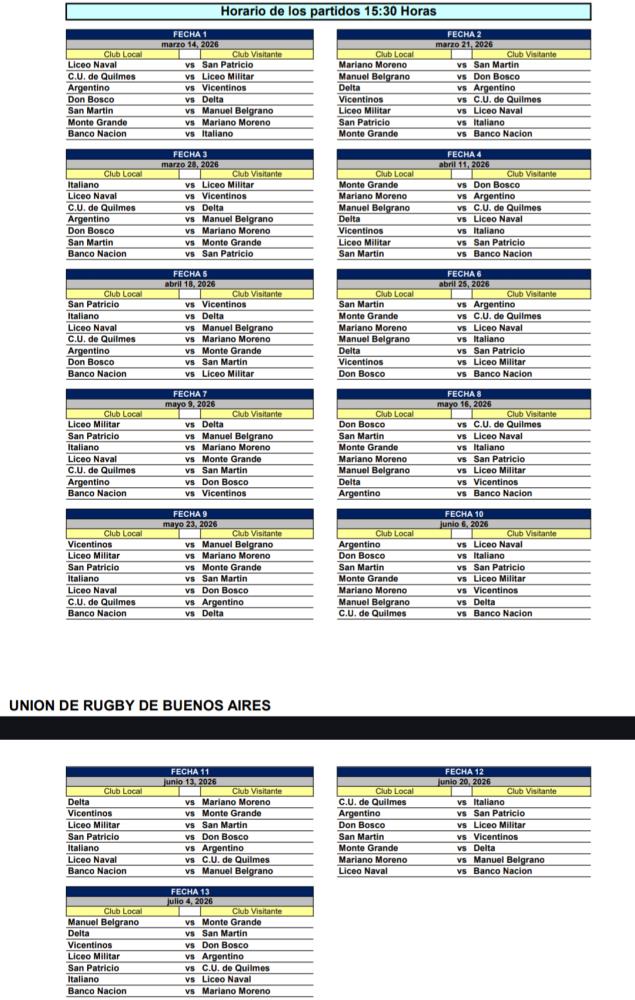Galería de Imagenes La tercera categoría del rugby de Buenos Aires ya conoce su fixture para el año que viene. El 14 de marzo inicia el campeonato y tendrá su final el 14 de noviembre. El campeón se quedará con el ascenso directo a Primera "A", mientras que del 2° al 5° se definirá el segundo ascenso.Los últimos dos descenderán a la Primera C, ya que esta temporada no habrá playoffs.En la primera fecha, el plato fuerte estará en Quilmes, donde el CUQ que viene de ser finalista recibirá al ascendido Liceo Militar.Monte Grande, que llega como campeón, será local ante Mariano Moreno, mientras que Vicentinos, otro de los ascendidos, visitará al CAR. Galería de Imagenes